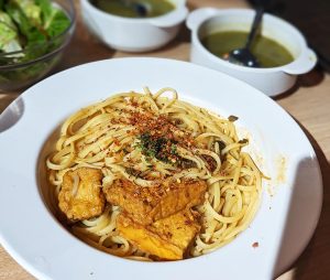 Next on the list is Green Dot. This chain of vegetarian fast food restaurants can be found all over Singapore, making it a convenient option for those on the go. Their menu features a variety of local dishes, alongside rice bowls, burgers, sandwiches, and wraps all made with plant-based protein sources. Our favourite is the local Rendang made with lionmane mushrooms, which is a delicious and satisfying gravy that goes beautifully with their selection of healthy red/brown rice.