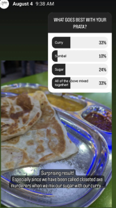 Once served, the prata is traditionally eaten with the fingers, torn into bite-sized pieces and dipped in curry (or sugar, or *horrors* sugar AND curry) before being consumed.
